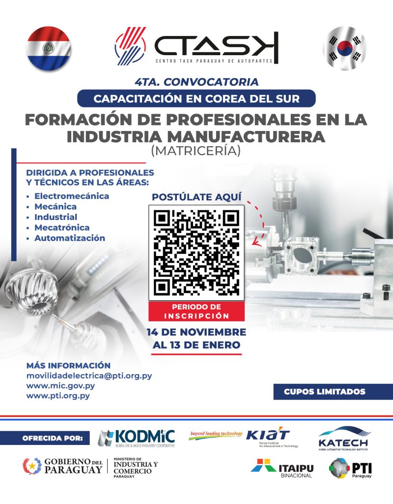 La convocatoria estará vigente hasta el 13 de enero de 2026 y busca formar a profesionales y técnicos paraguayos en el campo especializado de la matricería y la producción manufacturera.