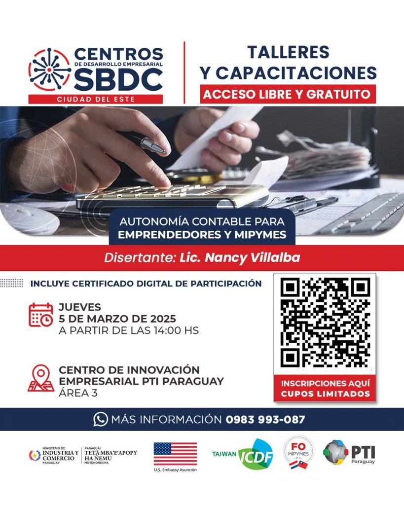 El Centro de Desarrollo Empresarial SBDC de Ciudad del Este, impulsado por el PTI Paraguay en alianza con el Ministerio de Industria y Comercio (MIC), inicia mañana su agenda de talleres y capacitaciones de acceso libre y gratuito, dirigida a emprendedores y MIPYMES.