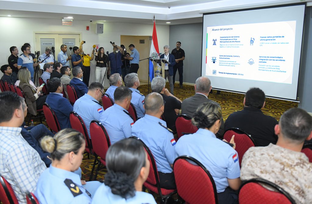 El técnico del PTI Paraguay, Ing. Gustavo Lucero, explicó los alcances del primer hito técnico de la iniciativa, correspondiente al proceso “Comunicaciones Alto Paraná”. El PTI Paraguay tiene a su cargo la modernización y ampliación del sistema de troncalización en el Área Metropolitana de Alto Paraná, incorporando nuevas funcionalidades que optimizarán la conectividad de alrededor de 150 comisarías. Estas mejoras permiten que la Policía Nacional cuente con un sistema de comunicación más robusto, confiable y eficiente para la coordinación operativa.