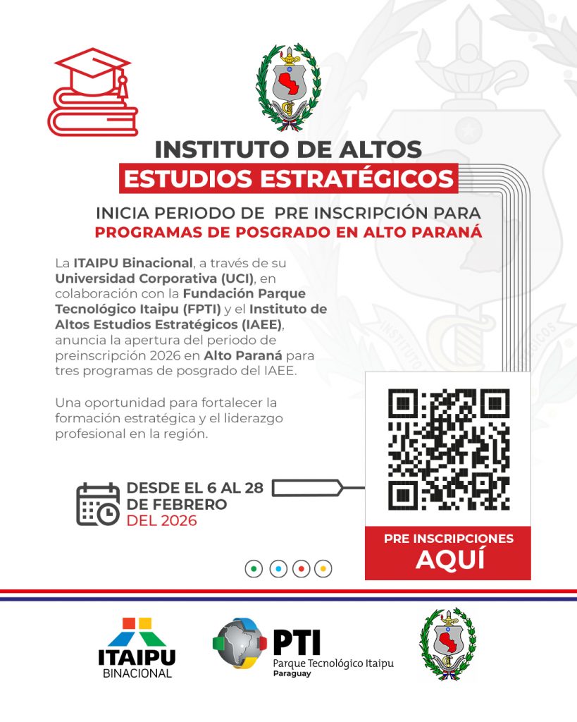 La ITAIPU Binacional, a través de su Universidad Corporativa (UCI), en colaboración con la Fundación Parque Tecnológico Itaipu Paraguay (FPTI) y el Instituto de Altos Estudios Estratégicos (IAEE), anuncia la apertura del periodo de preinscripción 2026 en Alto Paraná para tres programas de posgrado.