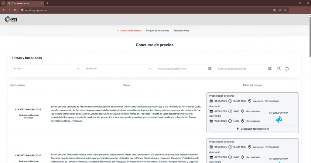 El Parque Tecnológico Itaipu Paraguay (PTI Paraguay) presentó oficialmente las actualizaciones de su Portal de Compras, una plataforma digital concebida como punto de encuentro oficial para la publicación de todos sus Concursos de Precios, tanto en la modalidad Concurso Limitado de Precios (CLP) como Concurso Público de Precios (CPP). Con esta herramienta, la institución busca ofrecer un canal más transparente, ordenado y accesible para los oferentes y proveedores interesados en participar de sus procesos de adquisición.